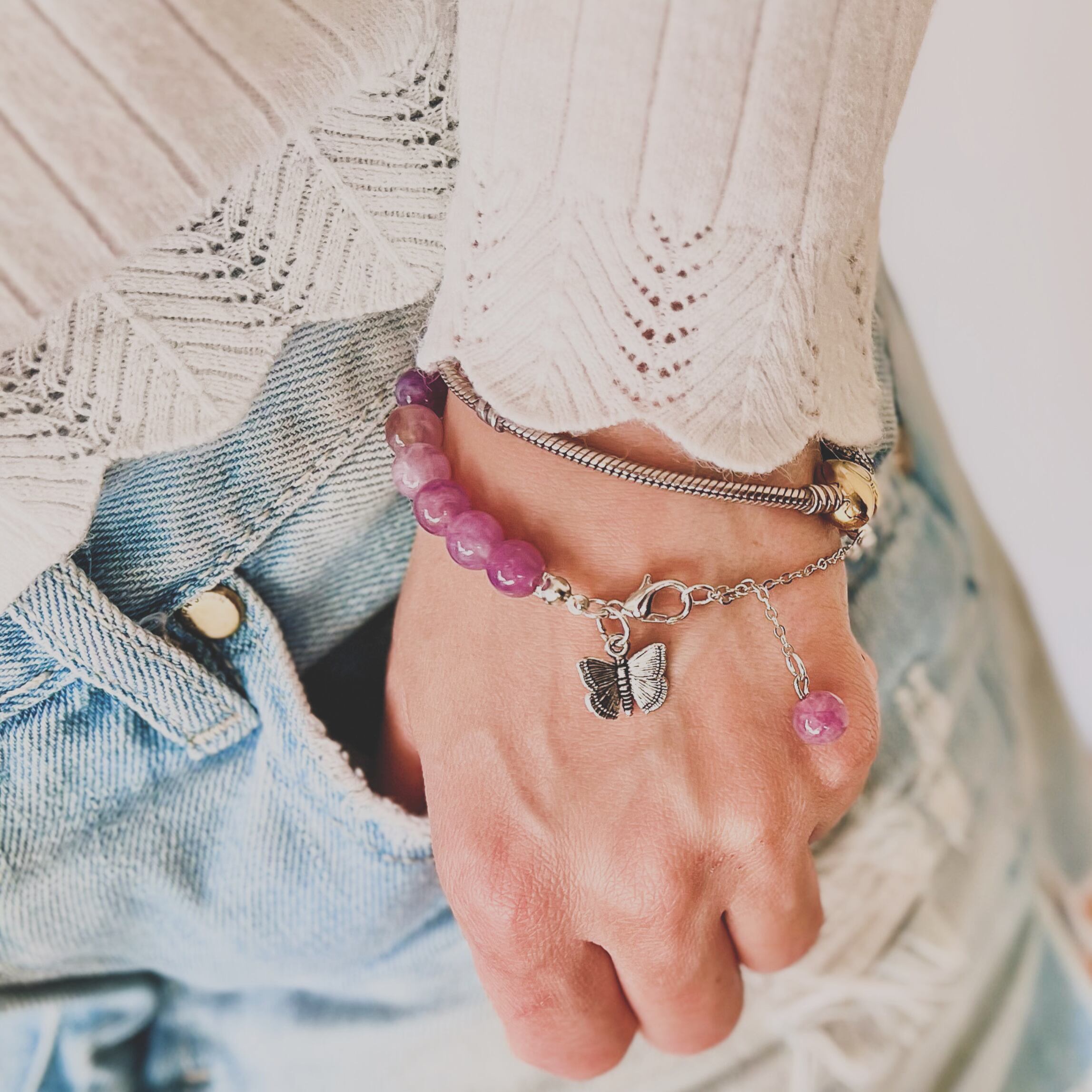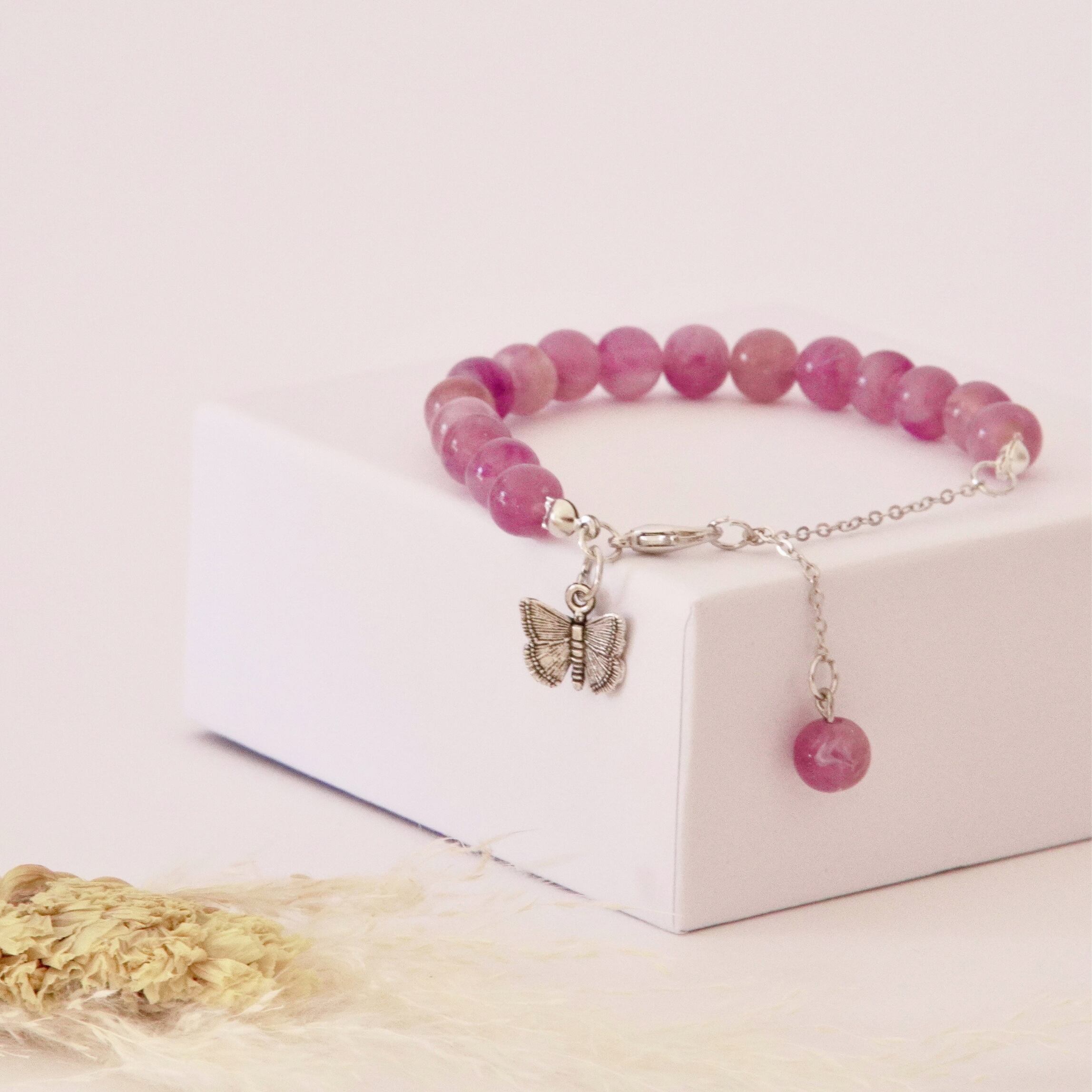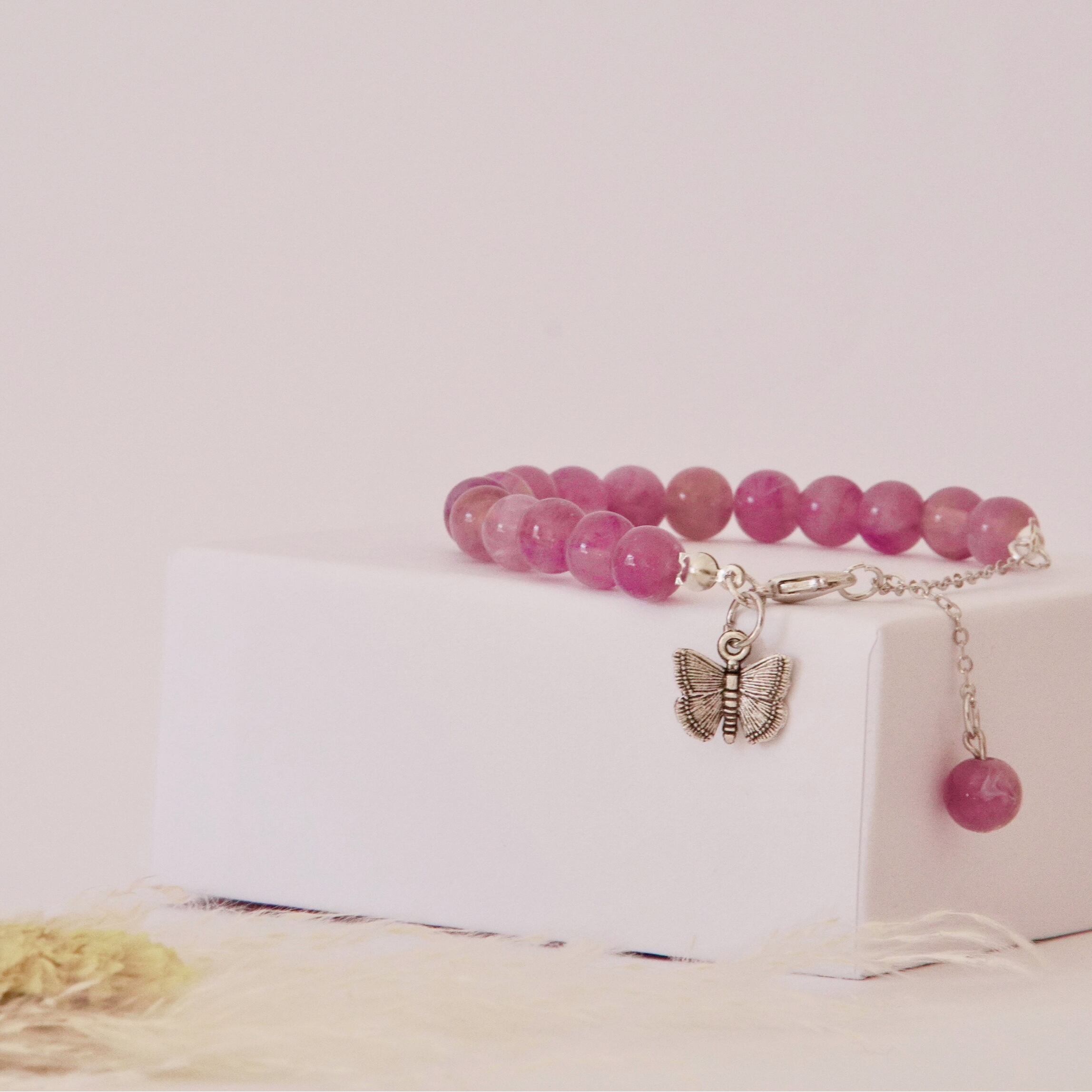 蝶は古くから幸運や変身の象徴とされており、その美しい羽や舞い踊るような動きには多くの人々が魅了されています。このブレスレットも、その美しさと象徴性を取り入れたデザインになっています。日常の中に少しの魔法を与え、あなたの腕元を輝かせることでしょう。